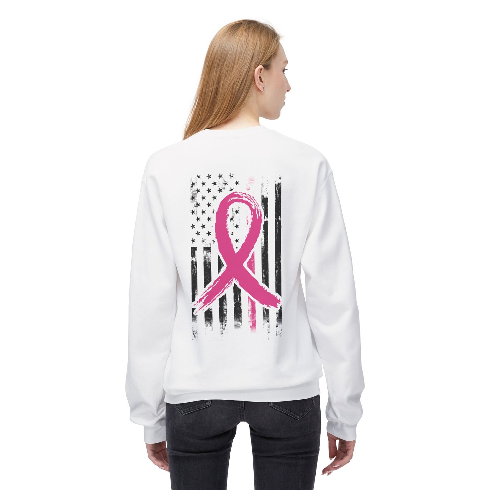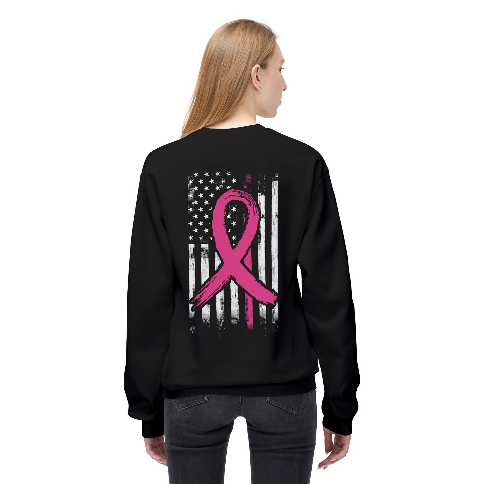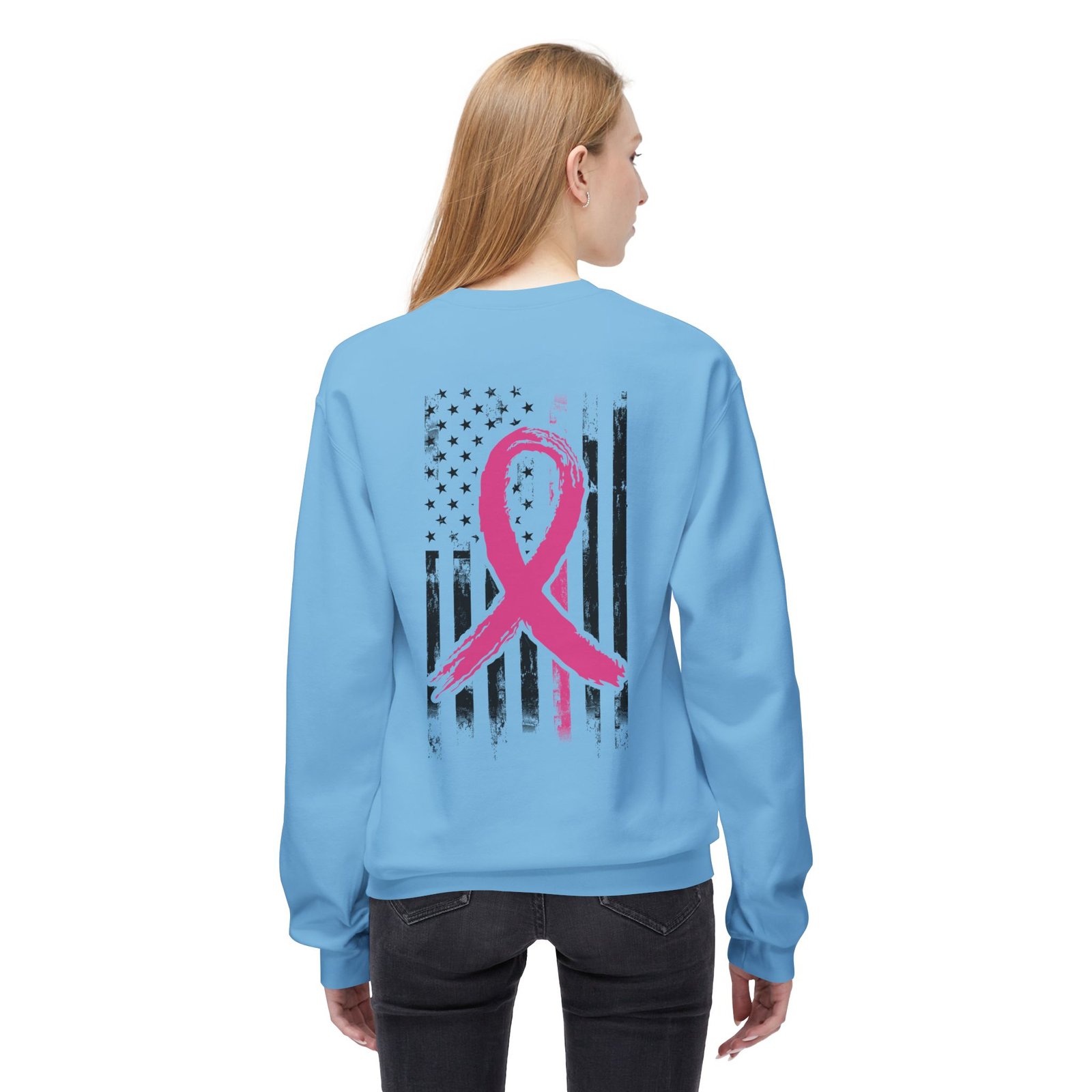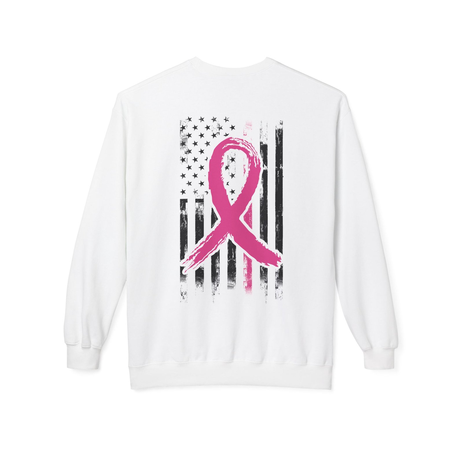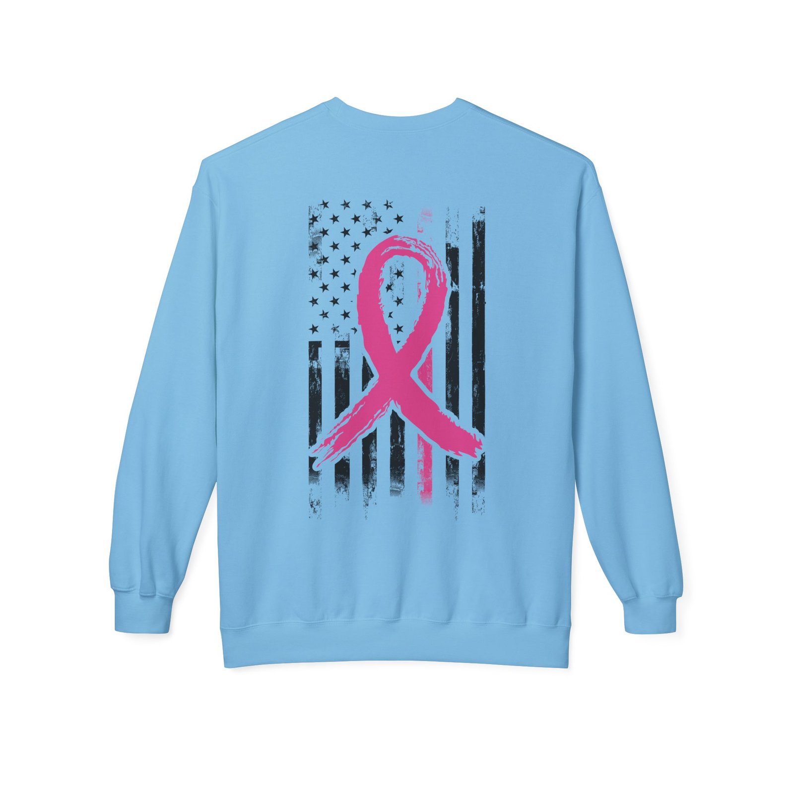 This patriotic Breast Cancer Awareness cozy and stylish with this unisex midweight fleece crewneck sweatshirt is a perfect way to show your support for a great cause while displaying your love for your country. The relaxed fit and soft fabric provide ultimate comfort, making it an ideal companion for cozy nights in or casual outings with friends. The design is eye-catching and meaningful, making it a fantastic addition to your wardrobe. It’s great for those who want to spread awareness and support during Breast Cancer Awareness Month.